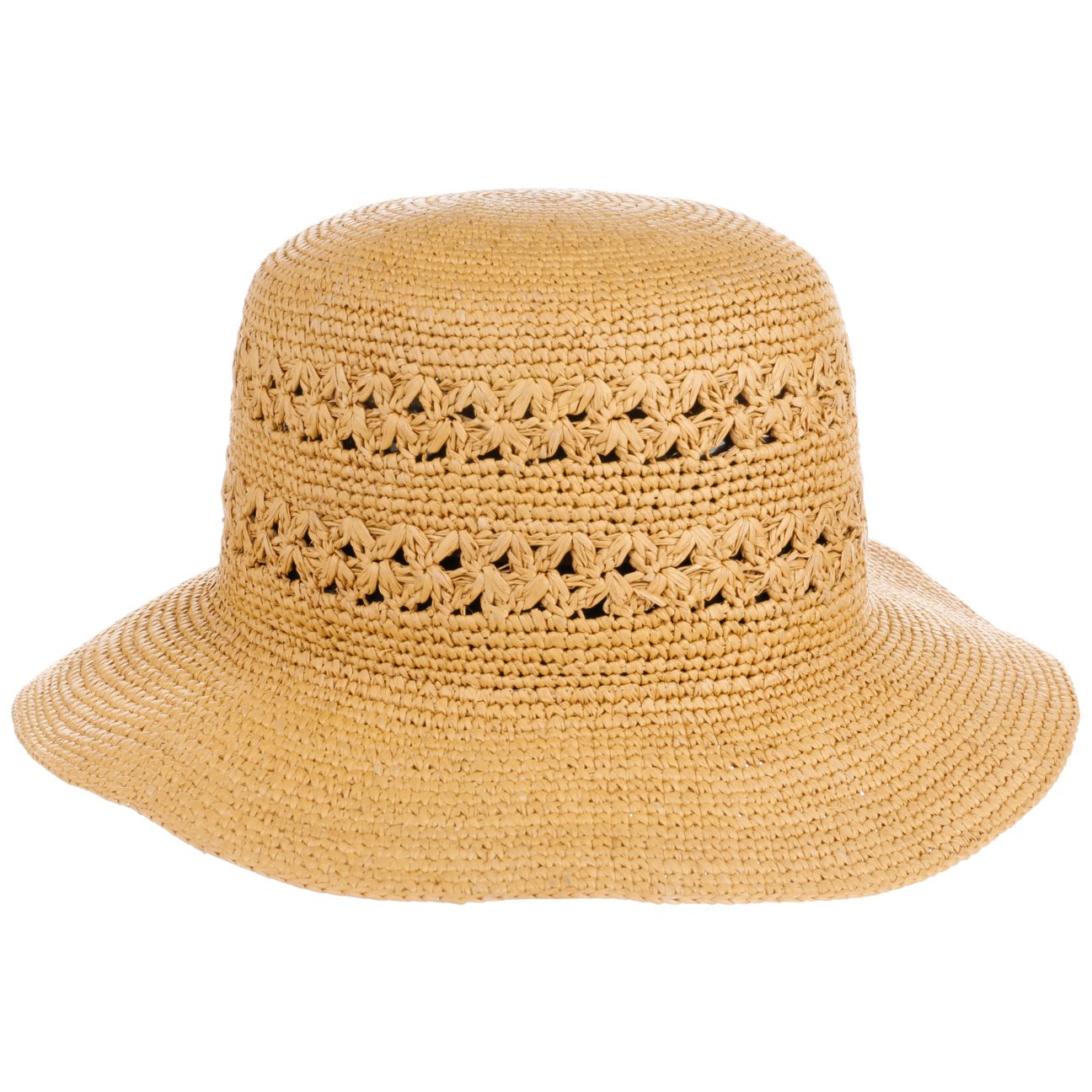Dieser gehäkelte Glockenhut ist ein wahrhaft feminines Accessoire. Sein aufwendiges Muster verleiht ihm einen romantischen Charme, während das flexible Naturstroh eine luftige Leichtigkeit verspricht. Auf Reisen oder bei sommerlichen Gartenpartys bietet der Strohhut nicht nur stilvolle Eleganz sondern auch angenehmen Schatten für Ihr Gesicht. Ein elastisches und saugfähiges Komfortfutterband im Inneren sorgt zudem für optimalen Tragekomfort.